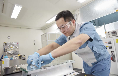 The performance required extends over many areas. Reducing the scattering of glass fragments if the glass of a tablet is broken, suppressing the reflection of fluorescent and other lamps, making it resist getting dirty, giving it an appropriate level of hardness so its surface isn’t scratched when it’s written on with a touch pen, and so on.