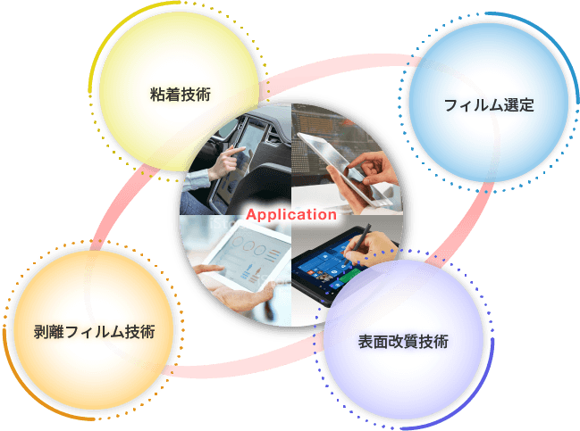 当社コア技術である、”表面改質技術”/” 粘着技術”/” 剥離フィルム技術”の組み合わせによって、さまざまなアプリケーションに応用できます。